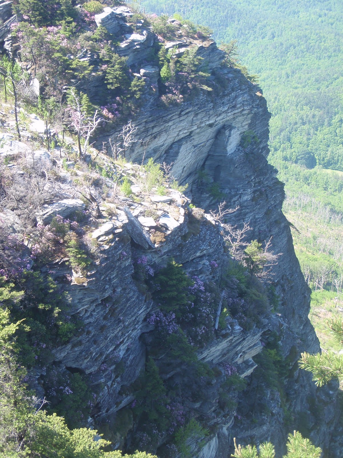 Linville Gorge was in prime Mountain Laurel blooming season. From the top of Dopey Duck, we could see over Tilted World wall, spotted with pink blooms. Quite a site on both fronts. That's a steep wall.