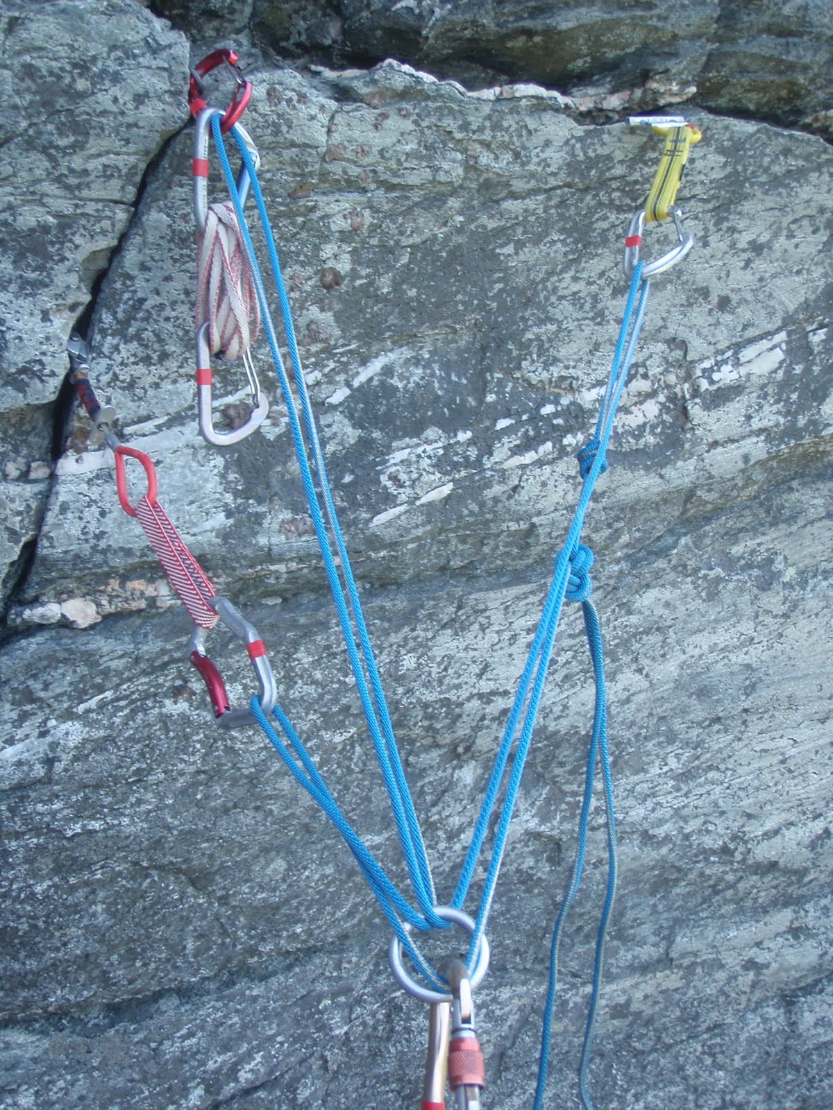 Three piece system, self equalizes, quick to set up, redundant via clove to the strongest piece, extension limited by shorting the longest leg with an overhand or 8 on a bite. If one piece blows, it looks like this: